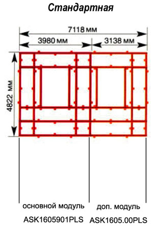 | Размеры однопостовой рамы ASK1605901PLS, мм | 3980X4822X100 | | Размеры доп. модуля ASK1605.00PLS, мм | 3138X4822X100 |