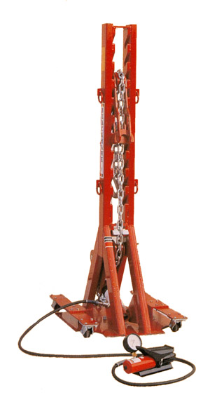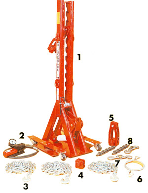 Это силовые башни, специально предназначенные для вытягивания кабин на стапеле Cab Bench. Цилиндр имеет 2 скорости натяжения, а сила тяги варьируется от 7,5 до 30 тонн (при помощи системы полиспаста). Высота натяжения – до 4,3 м, при этом сила тяги остаётся одинаковой. Возможно применение 2 башен одновременно. Они могут свободно перекатываться вокруг стапеля. При вытягивании башни не крепятся непосредственно к полу, а удерживаются от падения цепью с противоположной стороны. Башни могут доукомплекто-вываться дополнительными захватами для вытягивания, цепями, шкивами для вертикальной тяги, удлинителями и т.д.