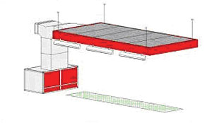 Полноразмерный пленум подвешиваемый к потолку на вантах Производительность вентиляционной системы 20.000 m3/ч Люминесцентное освещение Рециркулятор Вентиляционный канал в полу, один ряд решеток Без металлического основания