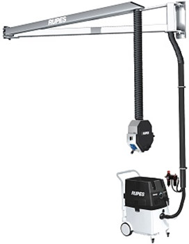Продукт RUPES нового поколения, установка Matic System представляет собой интегрированную многофункциональную систему пылеудаления с поворотной 6-метровой консолью. Консоль состоит из двух стальных элементов и оснащена выносным энергоблоком для быстрого подключения механизированного шлифовального и другого инструмента. Работу установки обеспечивает мобильный пылесос KS250M, отличающийся наличием двух мощных приводов и двухскоростным режимом работы. Пыль предварительно фильтруется картриджем и собирается в пылесборный мешок вместимостью до 7 кг.